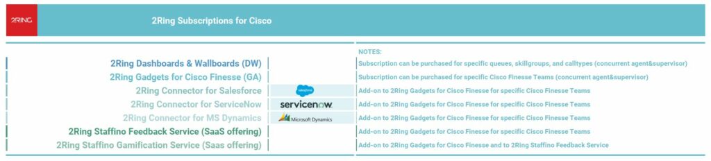 2Ring Gadgets for Cisco Finesse are still available in these three perpetual bundles – Standard, Enhanced, and Premium (CRM integrations require the Premium bundle). Here is the latest overview of our three bundles – request a demo at 2Ring.com/WebEx for more details.