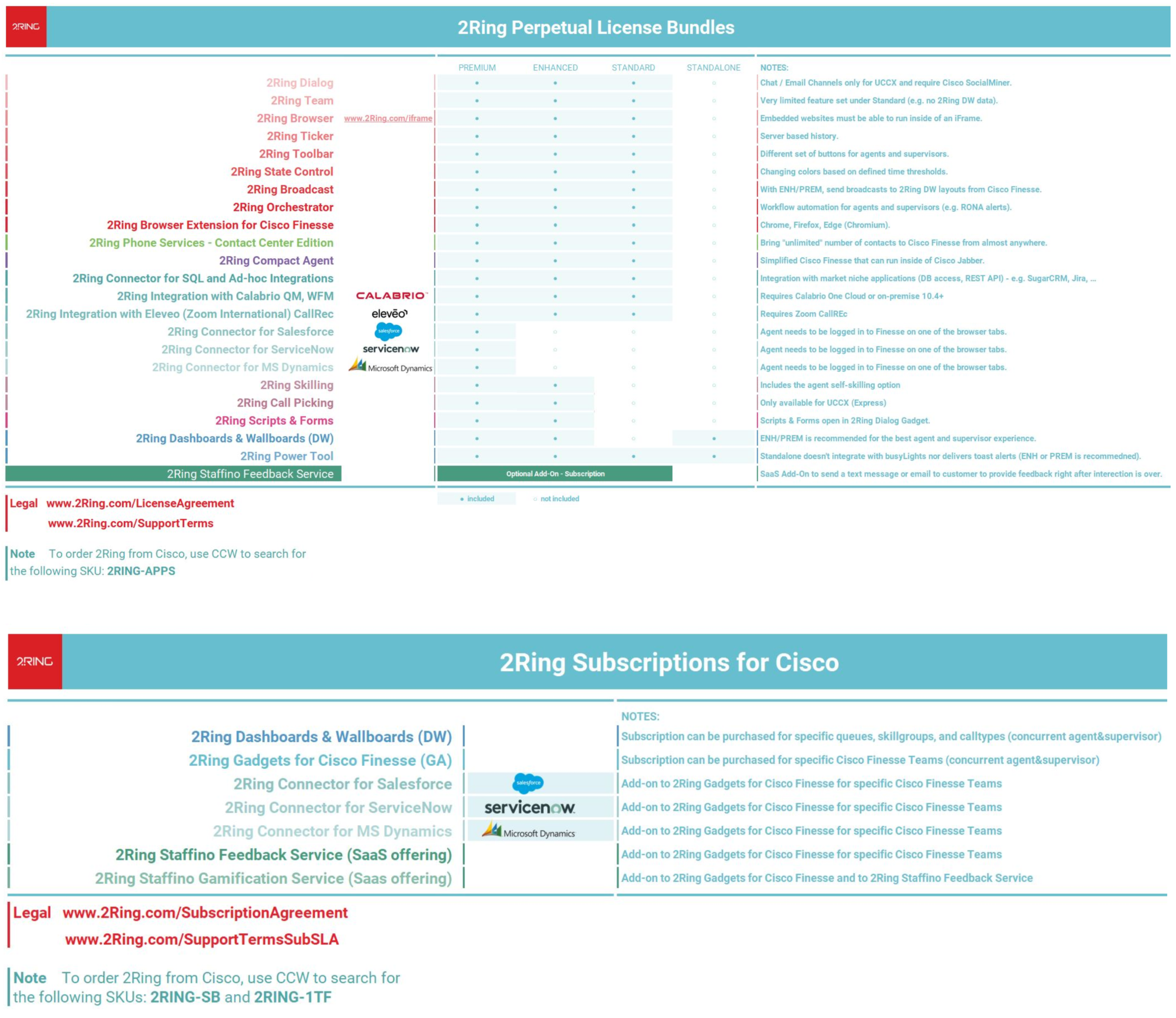 2Ring Gadgets for Cisco Finesse are still available in these three perpetual bundles – Standard, Enhanced, and Premium (CRM integrations require the Premium bundle). Here is the latest overview of our three bundles – request a demo at 2Ring.com/WebEx for more details.