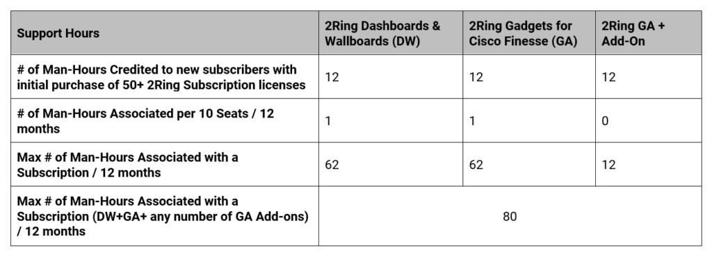 4.2 Support Hours. 2Ring allocates a certain number of man-hours towards providing Support under each subscription as described in the table below and set forth in the applicable order form for your Subscription accepted by 2Ring (“Support Hours”):
