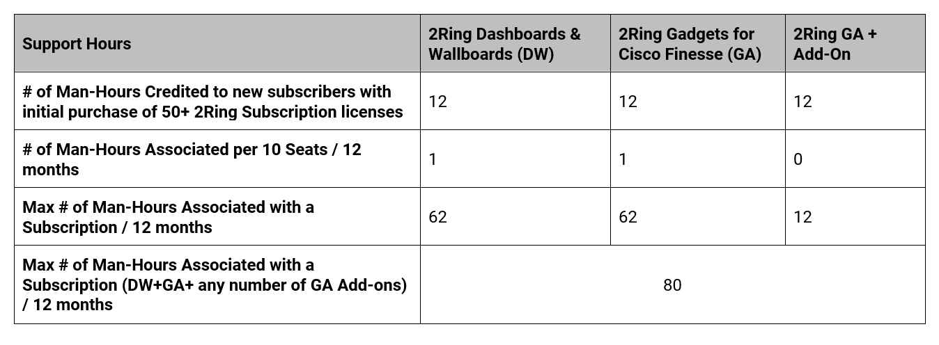 4.2 Support Hours. 2Ring allocates a certain number of man-hours towards providing Support under each subscription as described in the table below and set forth in the applicable order form for your Subscription accepted by 2Ring (“Support Hours”):