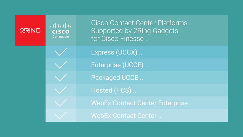 2Ring, a Cisco Preferred Solution partner, has been providing value to contact centers around the globe for almost 20 years. 2Ring Gadgets for Cisco Finesse is already used by hundreds of thousands of agents and supervisors globally. In 2018, 2Ring received an award from Cisco for the most innovative agent desktop tool. 2Ring solutions, services, and support are available directly from Cisco’s price list.