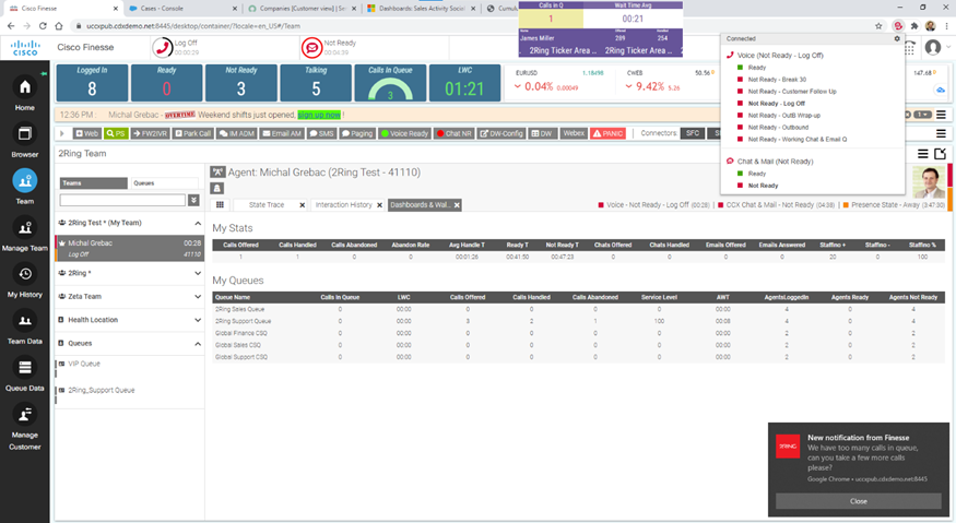 With this approach, agents get alerts about higher call volumes or scheduled breaks; are notified when their shift is almost over (see more on our integration with Calabrio’s WFM in our (Gadgets 5.1 release notes); and have immediate access to their personal metrics, state and interaction history. Most importantly, supervisors have superior visibility into agents’ performance. To keep it simple, all the features that Cisco provides in Finesse and all the additional features that 2Ring brings to the table on top of those are available to agents and supervisors. A CRM’s UI just does not cut it when it comes to providing flexible UI for contact center agents and supervisors.