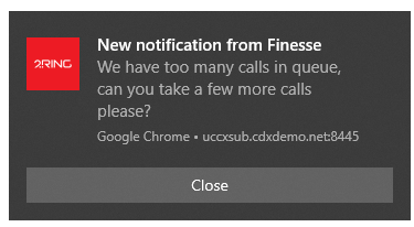 So-called toast notifications are another tool from the browser extensibility arsenal that can be used to display important alerts/notifications – and again, keep agents (and supervisors) up to speed on what is happening no matter what app they are currently working in.