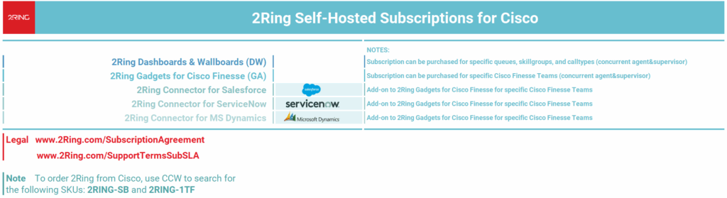 2Ring prefers that Cisco resellers quote 2Ring Dashboards & Wallboards and 2Ring Gadgets for Cisco Finesse (enhanced and premium bundle) from Cisco’s price list. If possible, please use this channel.